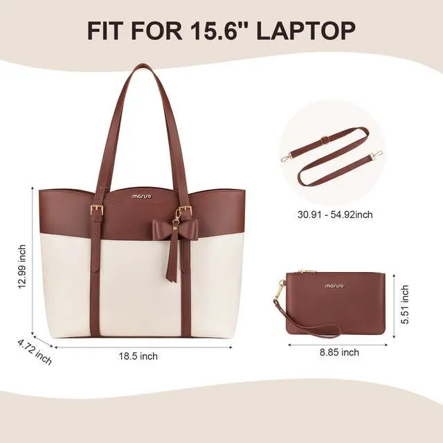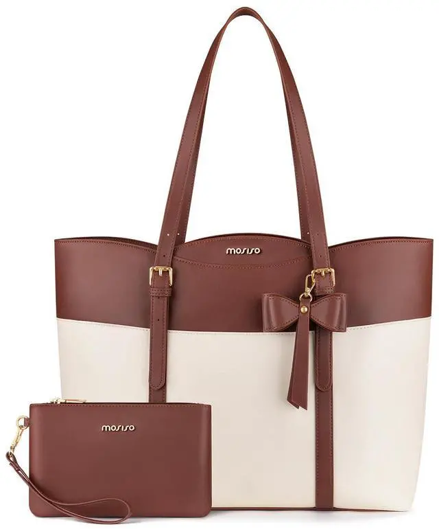 MOSISO Laptop Tote Bag for Women,15.6 inch PU Leather Arc-shaped Pocket Tote Bag&Clutch Purse,Large Capacity Work Handbag with Bowknot,Waterproof Computer Bags Work Briefcase for Business Office,Brown
