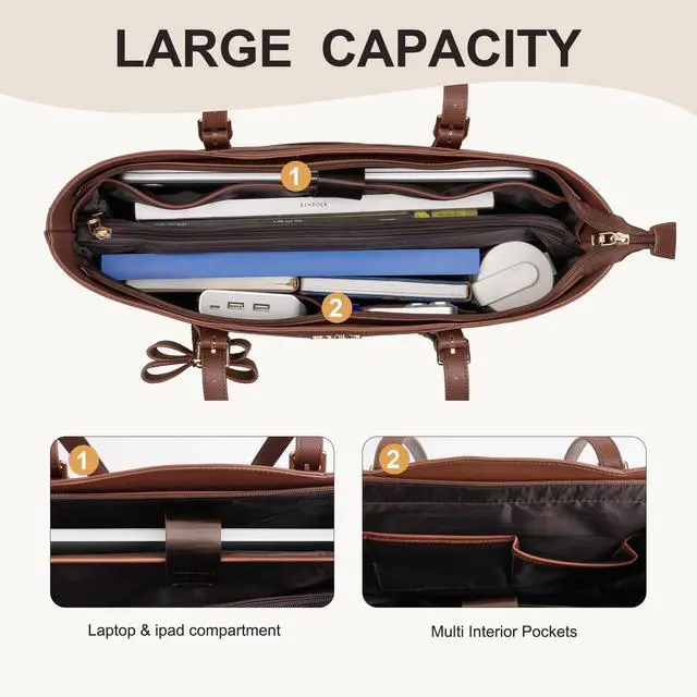 Large Capacity & Multiple Compartments. This tote bag holds your laptop, tablet documents and book. 3 square pocket, 2 pen pockets; 2 side cup pockets for water bottle inside. Extra small clutch purse to keep your mobile phone, keys, cards, and makeup. Whether you are working, commuting, or daily use, It is an ideal bag for women on the go.