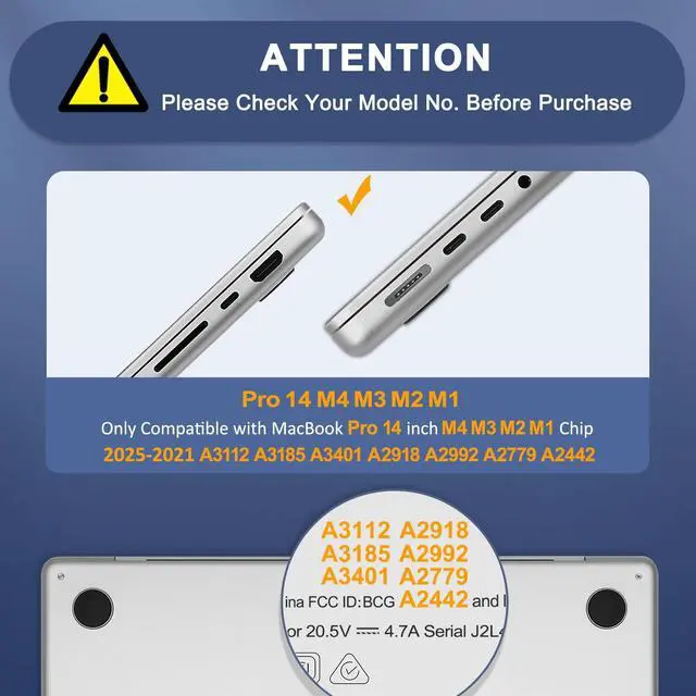 Please kindly check the model number "Axxxx" on the back of the laptop before your purchase, make sure you choose the exact same model number as the listing title stated "A3112" or "A3185" or "A3401" or "A2918" or "A2992" or "A2779" or "A2442" that compatible with MacBook Pro M4 14 inch case, compatible with MacBook Pro M3 14 inch case, compatible with MacBook Pro M2 14 inch case and compatible with MacBook Pro M1 14 inch case. WARNING: This case is NOT compatible with other model laptops.