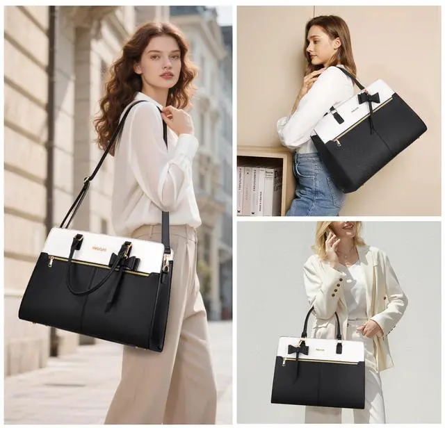 MOSISO Laptop Tote Bag for Women, 15.6 inch Waterproof PU Leather Work Bag with Clutch Purse & Bowknot, Large Capacity Handbag Shoulder Computer Bags Work Briefcase for Business Teacher Office, Black