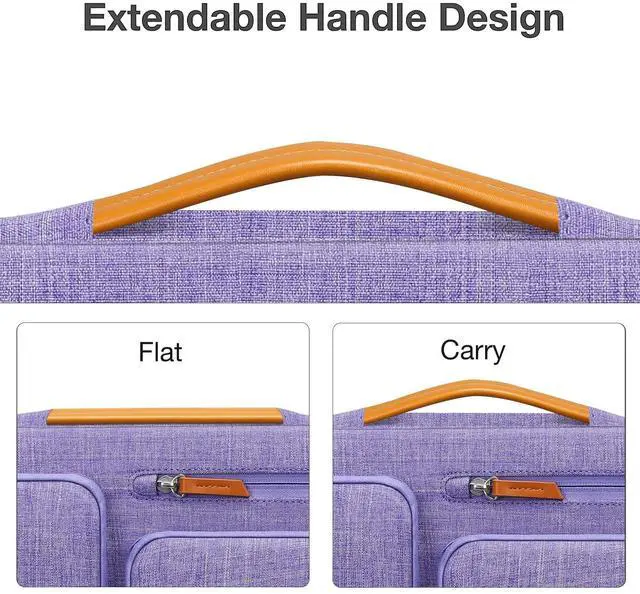 360 degree all around protective reinforced interior edge briefcase carrying case bag protect your laptop from any accidental dropping. Extendable handle design makes it to carry your laptop around in comfort, you can also tuck away the handle. Side opening zipper design, avoid accidental dropping of your laptop while carrying. 4 front zipper pockets provide enough space to keep mouse, earphone, pens and notepads, offering added convenience.