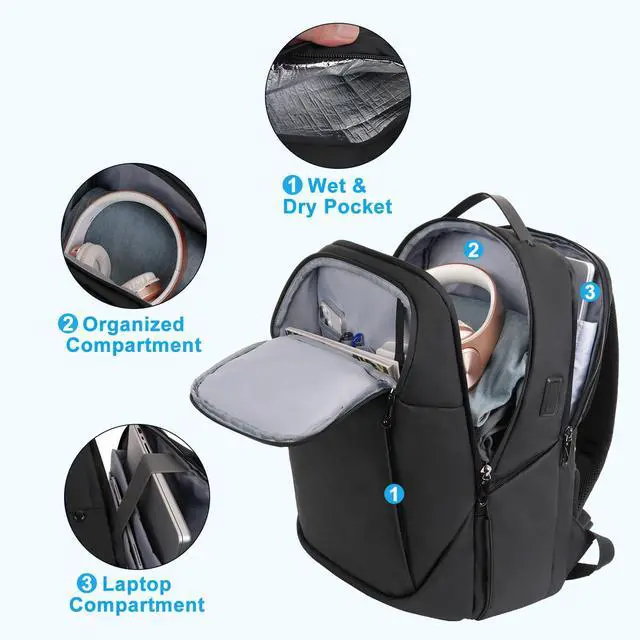 Multi Compartment Travel Daypack. This backpack has multiple compartments and pockets to ensure you can efficiently store and organize your belongings. This travel backpack has 1 main compartment with accessory organizer pockets, 1 front compartment, a front wet & dry pocket, a 16 inch aptop compartment and a back anti-theft zipper pocket, providing plenty of room for traveling out essentials