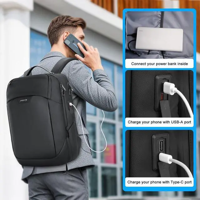 Laptop Backpack with USB Charging Port. With built in USB charging port outside and built in charging cable inside, this backpack offers you a convenient way to charge your phone while walking. Please noted that this backpack doesn't power itself, USB charging port only offers an easy access to charging device.