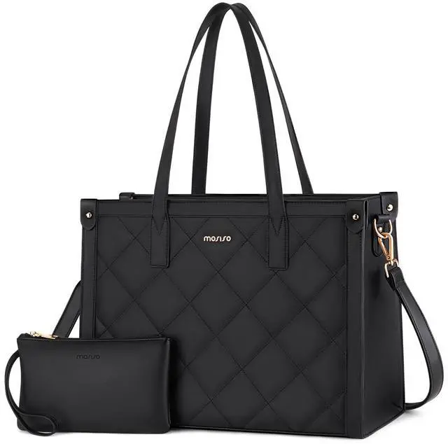 MOSISO Laptop Tote Bag for Women, 15.6 inch PU Leather Rhombus Quilted Work Bag with Cup Holder & Clutch Purse, Large Capacity Teacher Computer Briefcase for Business Office, Black