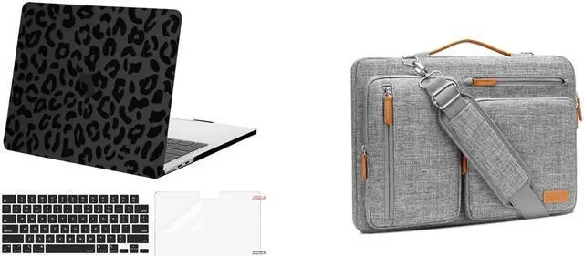 MOSISO Compatible with MacBook Air 13.6 inch A2681 M2, Plastic Leopard Grain Hard Shell Case&Keyboard Cover&Screen Protector & 16 inch Side Open Laptop Shoulder Bag with 4 Zipper Pockets, Black & Gray
