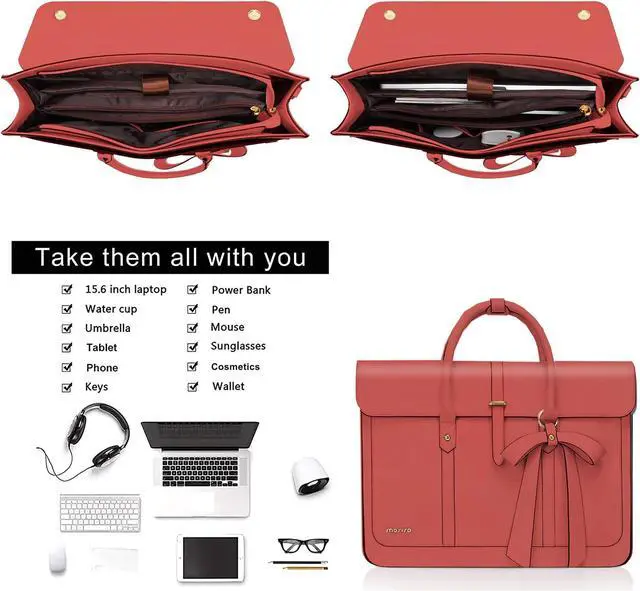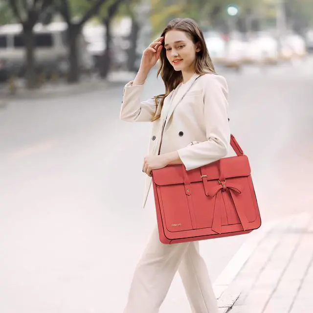 MOSISO Laptop Bag for Women, 15-15.6 inch PU Leather Laptop Shoulder Bags Convertible Backpack, 16 inch Messenger Bags Casual Handbag Work Briefcase Travel Computer Bag with Bowknot, Coral