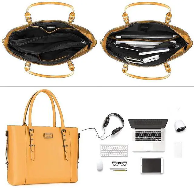 MOSISO PU Leather Laptop Tote Bag for Women (17- 17.3 inch), Waterproof Large Capacity Business Work Briefcase Shoulder Laptop Bag, Mustard Yellow