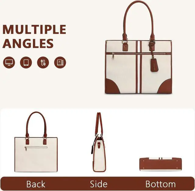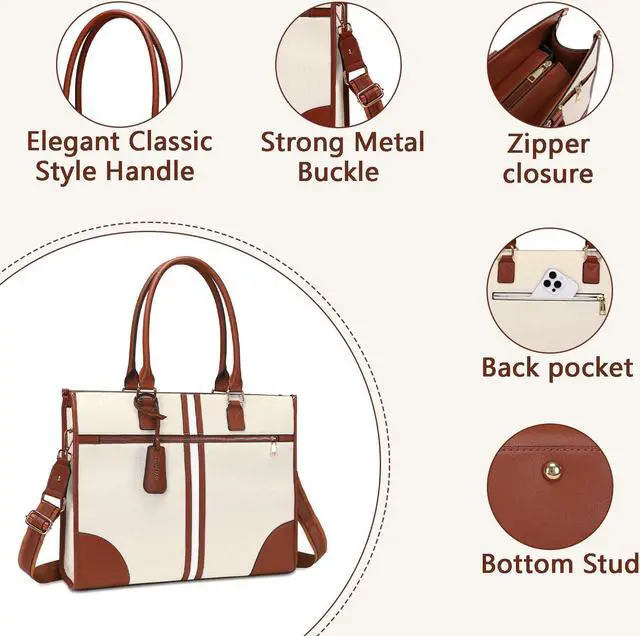 MOSISO Laptop Bag for Women, 15.6 inch PU Leather Laptop Tote Work Bag Purse with Front Zipper Pocket, Large Capacity Waterproof Patchwork Stripe Computer Briefcase for Business Office Work, Brown