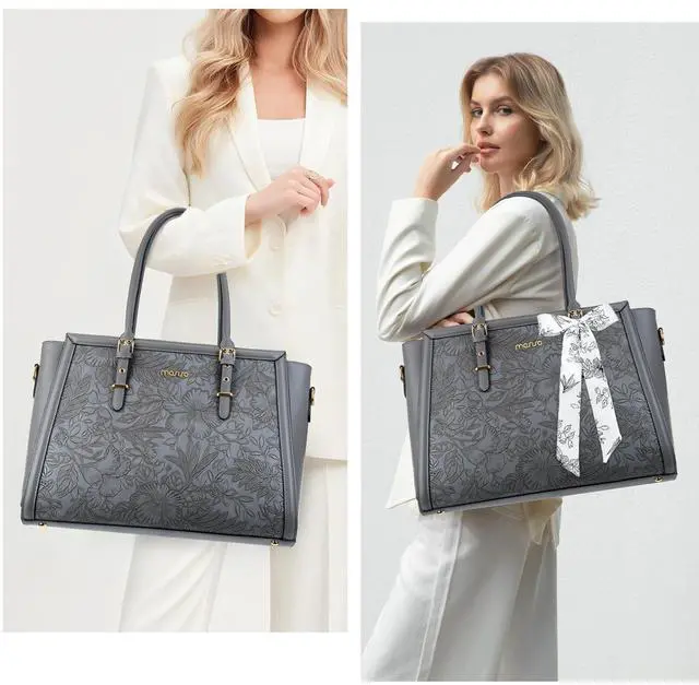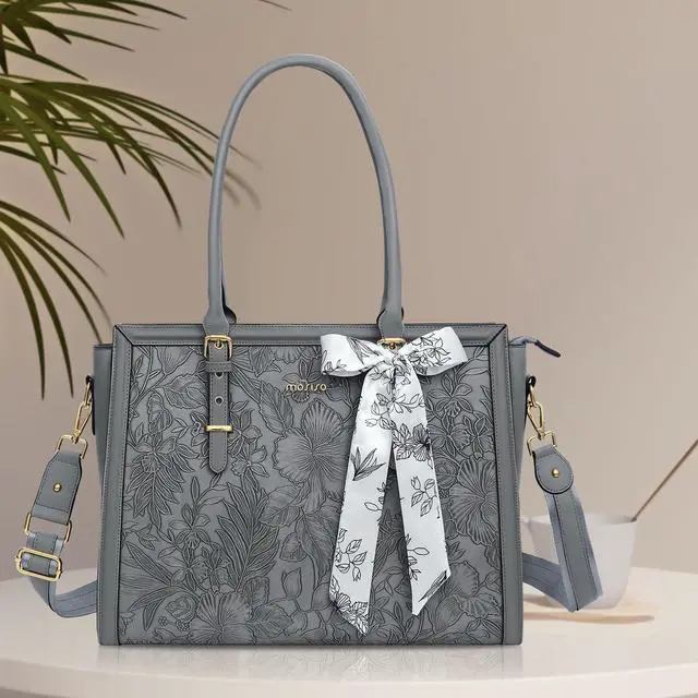 MOSISO Laptop Bag for Women, 15.6 -16 inch PU Leather Tote Bag Compatible with MacBook, HP, Dell, Asus Notebook, Front Embossed Retro Hibiscus Computer Bags with Silk Scarf&Clutch Purse, Gray