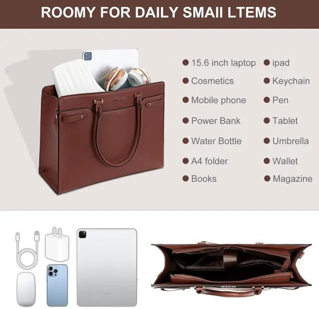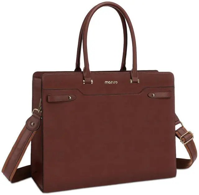 MOSISO Laptop Bag for Women, 15.6 inch Laptop Tote Bag, Waterproof Leather Front Magnetic Clasp Pocket Work Handbag, Large Capacity Computer Briefcase for Teacher Office Travel, Brown