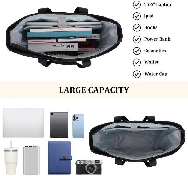 Large Capacity & Multiple Storage Teacher Tote Bag with Laptop Compartment. The computer compartment provides a thick padded foam section with a hook & loop strap closure for your laptop or tablet. Professional design to protect your laptop against accidental impacts and scratches. Side pocket keeps your water bottle and umbrella upright.