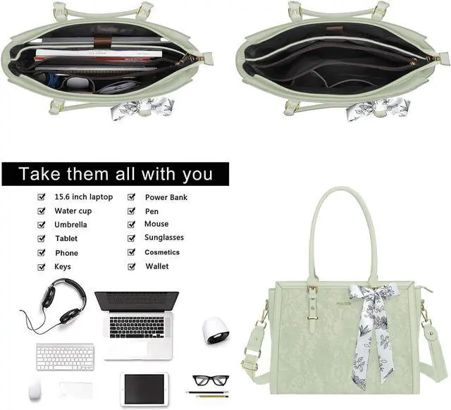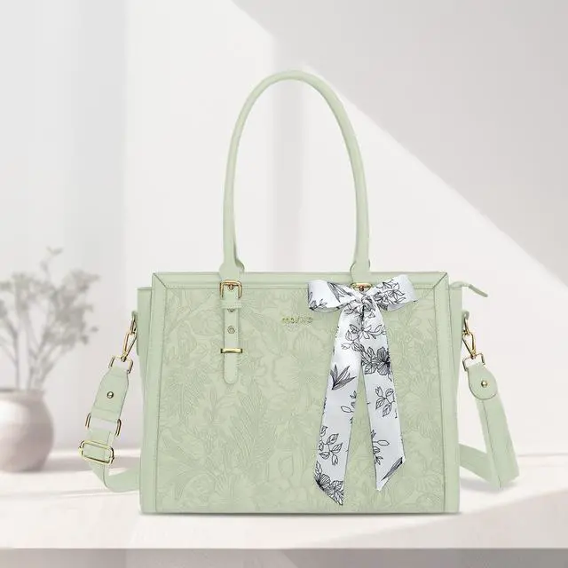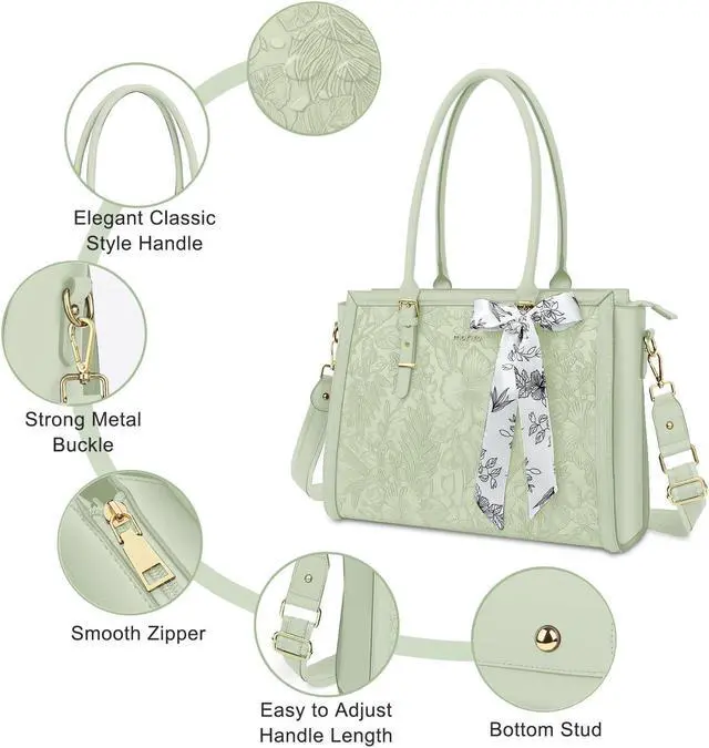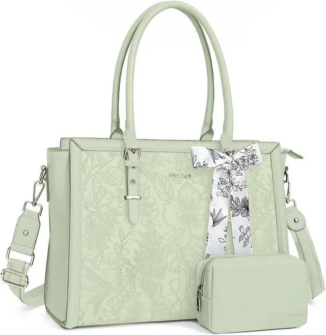 MOSISO Laptop Bag for Women, 17-17.3 inch PU Leather Tote Bag Compatible with MacBook, HP, Dell, Asus Notebook, Front Embossed Retro Hibiscus Computer Bags with Silk Scarf&Clutch Purse, Sage Green