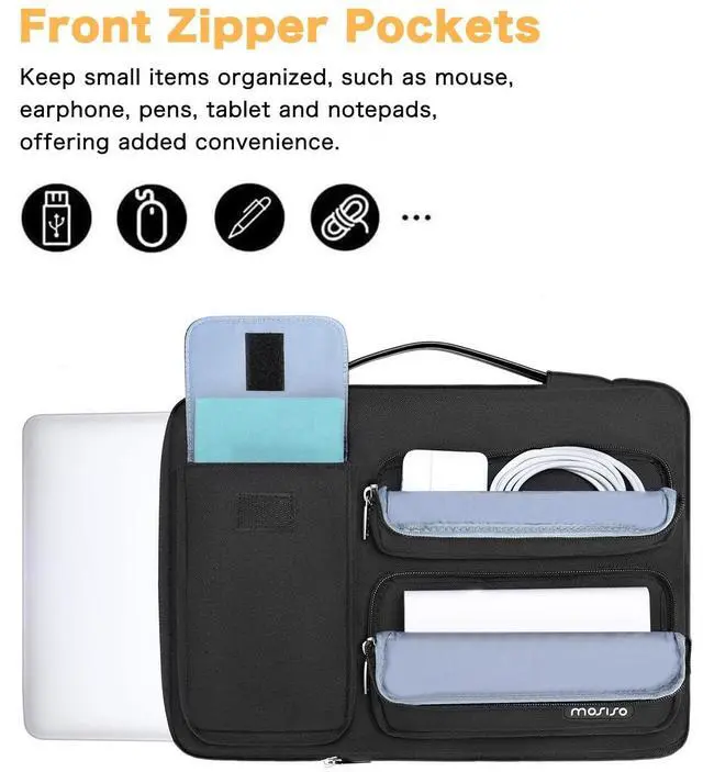 Multifuncional laptop sleeve with 3 front organizer pockets design enables you to carry your laptop / notebook / Ultrabook computer in a uniquely sleek style. Features a polyester foam padding layer and fluffy cu