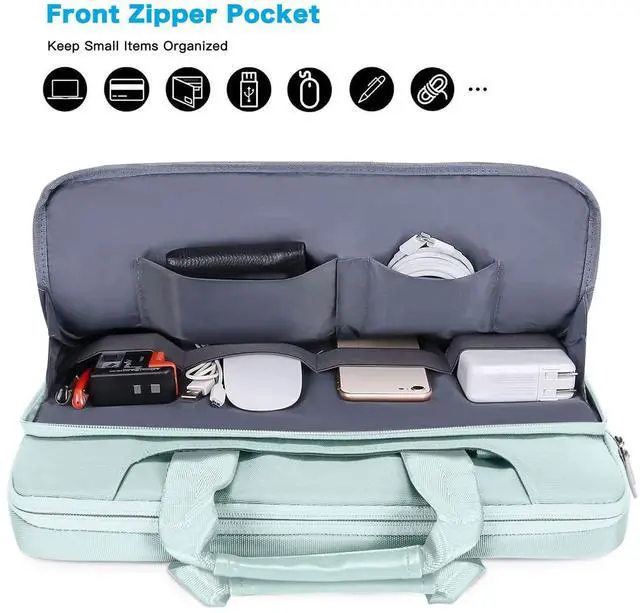 Matching color removable and adjustable padding shoulder strap varied from 29.5 - maximum 52.3 inch, top handles also can tuck away in the pockets when not needed. Large front pocket with inner small pocket keep all your daily accessories well organized. Proviode enough space to keep mouse, pens, mobile phone, cables, cards and other small accessories.