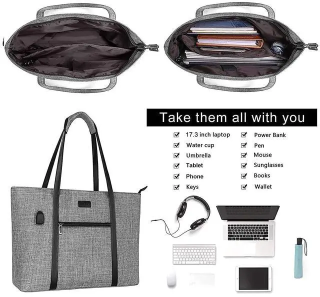 MOSISO USB Port Laptop Tote Bag for Women,Compatible with MacBook, 17-17.3 inch Notebook and Chromebook, Work Travel Business Computer Bag with Small Purse, Gray