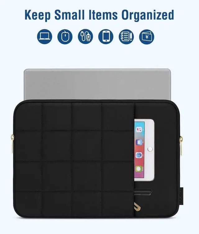 Front pocket dimension: 9.84 x 9.84 inches (L x W). The additional small pouch bag dimension: 6.69 x 4.33 x 1.57 inches (L x W x H). ^^ Made with square quilted puffy polyester material, features a polyester foam padding layer and fluffy fleece fabric lining. Protect your laptop from bump, shock and accidental scratches. ^^ Additional small storage pouch bag for you to storage laptop mouse and earphone. Same color as the big sleeve bag, harmony and stylish. Simple and exquisite square quilted puffy appearance carrying sleeve case cover bag with pocket is ideal for you to take your laptop out. ^^ Slim and lightweight, does not bulk your laptop up and can easily slide into your briefcase, backpack or other bag. Top opening zippers on the sleeve glides smoothly and allows convenient access to your laptop computer. The bag is perfect for working, traveling, daily use and business travel. ^^ Compatible with MacBook Pro 14 2025-2021 M5 M4 M3 M2 M1 A3434 A3112 A3185 A3401 A2918 A2992 A2779 A2442, compatible with MacBook Air 13 2017-2010 A1369 A1466, compatible with MacBook Pro 13 A1425 A1502 A1278 2008-2015; Compatible with Surface Book 3/2/1 13.5 / Surface Laptop 6/5/4/3 13.5 /Surface Laptop 13.8; Compatible with Dell Latitude/Chromebook 13.3; Compatible with HP Elitebook/Spectre/Envy/Stream 13.3; Compatible with Lenovo IdeaPad/ThinkPad Yoga 13.3; Compatible with Acer Chromebook Spin 13.3.