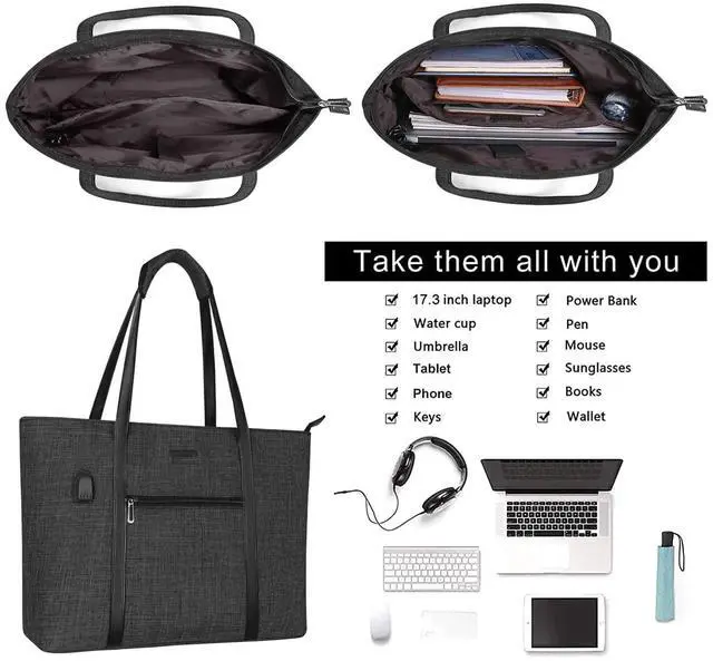 The small pouch case dimension: 7.87 x 4.92 inch (L x W). Compatible with MacBook, Notebook, Ultrabook 17 inch and up to 17.3 inch; may not compatible with all laptops. ^^ Roomy enough with 2 compartments for all your daily stuff. The computer compartment provides a thick padded foam section with a hook & loop strap closure for your laptop. Professional design to protect your laptop against accidental impacts and scratches. The other side compartment for magazines. The small pocuh case for mobile phone, keys, mouse, passports, credit cards, cash, makeups and so on. ^^ Perfect for daily use, casual use and professional use too, convenient and comfortable. With built in USB charging port outside and built in charging cable inside, this laptop tote bag offers you a convenient way to charge your phone while walking. Please noted that this laptop tote bag doesn't power itself, usb charging port only offers an easy access to charging device. ^^ Durable sturdy flat PU handle with detachable wrapped pad for long time comfortably carrying. This attractive fashionable laptop tote bag is ideal for daily use at shopping, office, business, work, weekend, outdoor activities, travel, gyms, camp, etc.