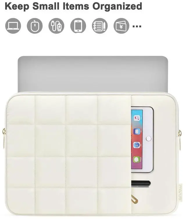 Front pocket dimension: 9.84 x 9.84 inches (L x W). The additional small pouch bag dimension: 6.69 x 4.33 x 1.57 inches (L x W x H). ^^ Made with square quilted puffy polyester material, features a polyester foam padding layer and fluffy fleece fabric lining. Protect your laptop from bump, shock and accidental scratches. ^^ Additional small storage pouch bag for you to storage laptop mouse and earphone. Same color as the big sleeve bag, harmony and stylish. Simple and exquisite square quilted puffy appearance carrying sleeve case cover bag with pocket is ideal for you to take your laptop out. ^^ Slim and lightweight, does not bulk your laptop up and can easily slide into your briefcase, backpack or other bag. Top opening zippers on the sleeve glides smoothly and allows convenient access to your laptop computer. The bag is perfect for working, traveling, daily use and business travel. ^^ Compatible with MacBook Pro 14 2025-2021 M5 M4 M3 M2 M1 A3434 A3112 A3185 A3401 A2918 A2992 A2779 A2442, compatible with MacBook Air 13 2017-2010 A1369 A1466, compatible with MacBook Pro 13 A1425 A1502 A1278 2008-2015; Compatible with Surface Book 3/2/1 13.5 / Surface Laptop 6/5/4/3 13.5 /Surface Laptop 13.8; Compatible with Dell Latitude/Chromebook 13.3; Compatible with HP Elitebook/Spectre/Envy/Stream 13.3; Compatible with Lenovo IdeaPad/ThinkPad Yoga 13.3; Compatible with Acer Chromebook Spin 13.3.