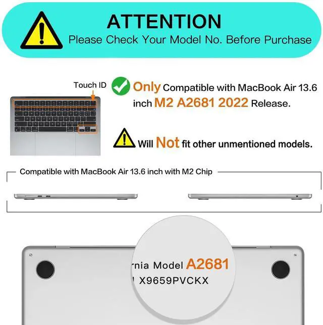 Designed ONLY to be compatible with MacBook Air 13.6 inch M2 Chip with Liquid Retina Display & Touch ID 2022 Release (model: A2681 - MLXW3LL/A, MLXX3LL/A, MLXY3LL/A, MLY03LL/A, MLY13LL/A, MLY23LL/A, MLY33LL/A, MLY43LL/A). WARNING: This case is NOT compatible with other model laptops.