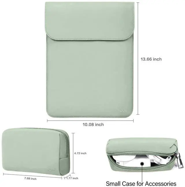 Dimension of the large laptop sleeve is 13.66 x 10.08 inch (L x W); dimension of the small accessory case is 7.68 x 4.72 x 1.77 inch (L x W). ^^ Compatible with MacBook Air 13 13.6 inch with Retina Display Touch ID 2025-2018 (M4 A3240/M3 A3113/M2 A2681/M1 A2337/A2179/A1932), compatible with MacBook Pro 13 2025-2016 (M2 M1 A2338/A2289/A2251/A2159/A1989/A1706/A1708); Compatible with Surface Pro 11/10/9/8/X 13, Compatible with iPad Pro 12.9 inch (1st/2nd/3rd/4th/5th/6th Gen) 2015-2022; Compatible with Dell XPS/Latitude 13; Compatible with HP Pavilion 13; Compatible with Lenovo Yoga 13.3; Compatible with HUAWEI MateBook 13/X 13/X Pro 13.9.