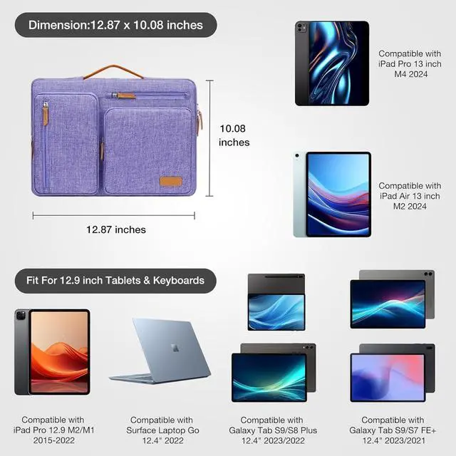 Vertical pocket dimensions: 2.99 x 6.89 inches (L x W). ^^ 360 degree all around protective reinforced interior edge briefcase carrying case bag protect your tablet from any accidental dropping. Extendable handle design makes it to carry your tablet around in comfort, you can also tuck away the handle. Side opening zipper design, avoid accidental dropping of your tablet while carrying. 4 front zipper pockets provide enough space to keep mouse, earphone, pens and notepads, offering added convenience. ^^ The tablet sleeve with organizer pockets outer polyester fabric of the case enable you to carry your tablet / notebook / Ultrabook computer in a uniquely sleek style. Features a polyester foam padding layer and fluffy cushion for bump and shock absorption and protection of your tablet against dust, dirt, bump, shock and accidental scratches. ^^ Slim and lightweight; does not bulk your tablet up and can easily slide into your briefcase, backpack, or other bag. This protective carrying sleeve case cover bag with handle and pockets is ideal for you to take your tablet out for business and travelling. ^^ Compatible with 13 inch iPad Air M3 2025, 13 inch iPad Air M2 2024, 13 inch iPad Pro M4 2024, iPad Pro 12.9 M2/M1 2022/2021, iPad Pro 12.9 3rd / 4th Gen 2018-2020 with Magic Keyboard/Smart Keyboard Folio, iPad Pro 12.9 2st Gen 2017, iPad Pro 12.9 1st Gen 2015, Surface Pro X, Surface Laptop Go 12.4, Surface Pro 7/Surface Pro 6 12.3 /Surface Pro 4/Surface Pro 3/Surface Pro LTE 12.3 inch, Galaxy Tab S9+ 12.4 2023, Galaxy Tab Pro S 12.2, Galaxy Tab S8+ 12.4, MateBook 12.
