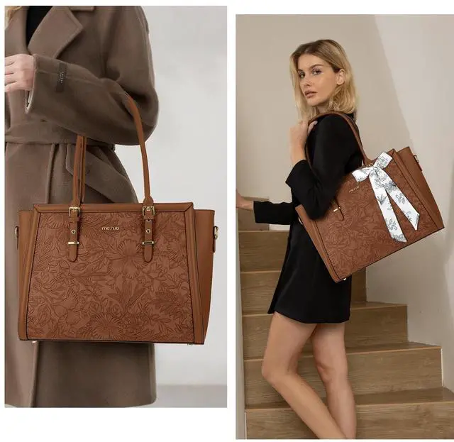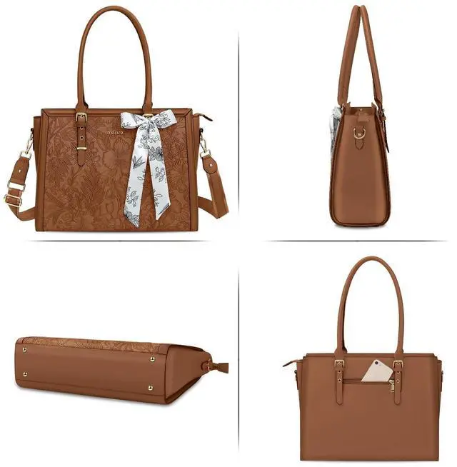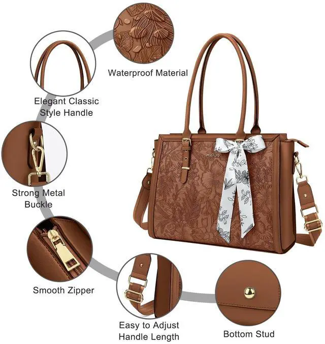 The small pouch case dimension: 7.87 x 4.73 x 2.36 inch (L x W x H). ^^ Roomy enough with 3 compartments for all your daily stuff. The computer compartment in the middle provides a thick padded foam section with a hook & loop strap closure for your laptop or tablet. Professional design to protect your laptop against accidental impacts and scratches. The other two side compartments & matching color small pouch case can store your jewelry, mobile phone, keys, mouse, passports, credit cards, cash, makeups and so on. ^^ Made of waterproof PU leather material, durable and fashion. Removable and adjustable padding shoulder strap varied from 31.89 -maximum 53.93 inch. Removable shoulder strap allows you to carry it as a cross body bag, shoulder bag or tote bag. The detachable silk scarf makes your bag stylish and elegant. Reinforced bottom with 4 rivets protects your bag from damage. ^^ This attractive fashionable front embossed retro hibiscus waterproof PU leather laptop tote bag is ideal for daily use at shopping, office, business trip, work, weekend, outdoor activities, outdoor holiday, travel, gyms, camp, etc.