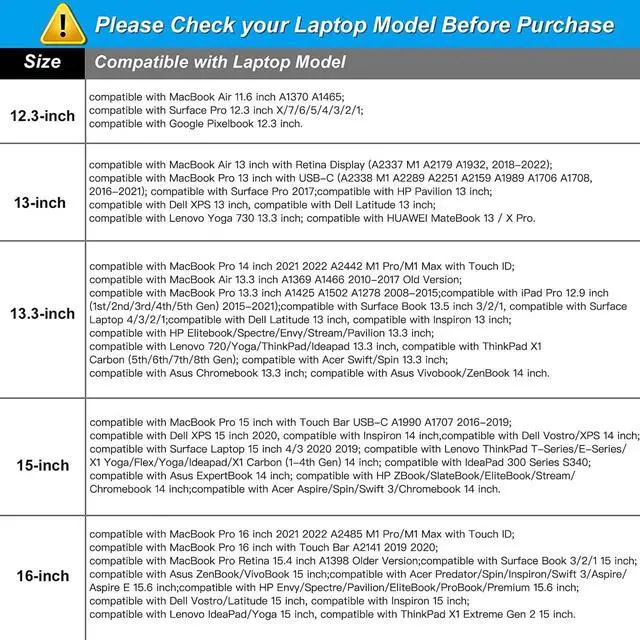 H); external dimension is: 6.3 x 0.59 x 5.31 inch (L x W x H). ^^ Features a neoprene foam padding layer and fluffy fleece fabric lining for bump and shock absorption and protection of your computer from accidental scratches. ^^ Additional small storage pouch bag for you to storage laptop mouse and earphone. Same color as the big sleeve bag, harmony and stylish. This protective carrying sleeve case cover bag with small pouch is ideal for you to take your laptop out. ^^ Slim and lightweight; does not bulk your laptop up and can easily slide into your briefcase, backpack or other bag. Top-loading zipper on the sleeve glides smoothly and allows convenient access to your laptop computer. ^^ Compatible with MacBook Pro 16 inch 2025-2019 M4 A3403 A3186 M3 A2991 M2 A2780 M1 A2485 A2141, compatible with MacBook Pro Retina 15.4 A1398; Compatible with Surface Book 3/2/1 15; Compatible with ASUS ZenBook/VivoBook Go 15.6; Compatible with Lenovo Essential IdeaPad/IdeaPad 3i Chromebook/IdeaPad 1/V15 15.6; Compatible with Acer Aspire Go 15.6; Compatible with NIMO 15.6, Compatible with HP Victus/ProBook/Spectre/Envy/Omen/Pavilion 15.6; Compatible with Dell Inspiron/XPS/Vostro/Latitude 15.6.