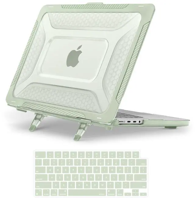 PC case dimension: 14.05 x 9.81 x 0.7 inch, compatible with MacBook Pro M4 16 inch case, compatible with MacBook Pro M3 16 inch case, compatible with MacBook Pro M2 16 inch case and compatible with MacBook Pro M1 16 inch case (models: A3403 & A3186 & A2991 & A2780 & A2485) Pro Max Chip with Liquid Retina XDR Display & Touch ID with dimension: 14.01 x 9.77 x 0.66 inch (2025 2024 2023 2022 2021 Released). ^^ The built-in foldable kickstands provide an appropriate ergonomic viewing & typing angle, give you a better visual experience. Engineered shock-absorbing beveled ridges honeycomb design wraparound TPU bumper heavy duty hard shell, provides ultimate protection for your laptop against scratches, drops, accidental scuffs and other damages. ^^ NO Cut Out design. Fully vented for heat disbursement, fully access to all buttons and features. Totally removable, easy to put on and take off that will not add any risk of harming your laptop during application. This comfortable protective hard shell case can be used for daily, office, home, travelling, working & study, shock-absorbent, anti-cracking, anti-fingerprint and anti-scratch. ^^ Including keyboard cover to protect your keyboard against spills.