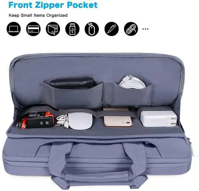 External Dimensions: 14.96 x 1.39 x 10.63 inch (L x W x H). The front horizontal side pocket dimensions: 13.78 x 7.68 inch (L x W). ^^ 360 degree all around protective reinforced interior edge protect your laptop from any accidental dropping. Features foam padding layer and fluffy fleece fabric lining for bump and shock absorption and protection of your computer from accidental scratches. Top-loading double zippers on the bag glide smoothly and allows convenient access to your laptop computer. ^^ Matching color removable and adjustable padding shoulder strap varied from 29.5 - maximum 52.3 inch, top handles also can tuck away in the pockets when not needed. Large front pocket with inner small pocket keep all your daily accessories well organized. Proviode enough space to keep mouse, pens, mobile phone, cables, cards and other small accessories. ^^ You can use it as shoulder bag, briefcase bag and sleeve bag in whatever way you like. Back luggage strap allows bag to slide over the luggage tube, secure your bag in place, provides a convenient way to carry the bag and release your shoulder. ^^ Compatible with MacBook Pro 14 2025-2021 M5 A3434 M4 A3112 A3185 A3401 M3 A2918 A2992 M2 A2779 M1 A2442, compatible with MacBook Air 13 2017-2010 A1369 A1466, compatible with MacBook Pro 13 A1425 A1502 A1278 2008-2015; Compatible with Surface Book 3/2/1 13.5 /Surface Laptop 6/5/4/3 13.5 /Surface Laptop 13.8; Compatible with Dell Latitude/Chromebook 13.3; Compatible with HP Elitebook/Spectre/Envy/Stream 13.3; Compatible with Lenovo IdeaPad/ThinkPad 13.3; Compatible with Acer Chromebook 13.3.