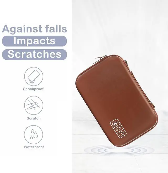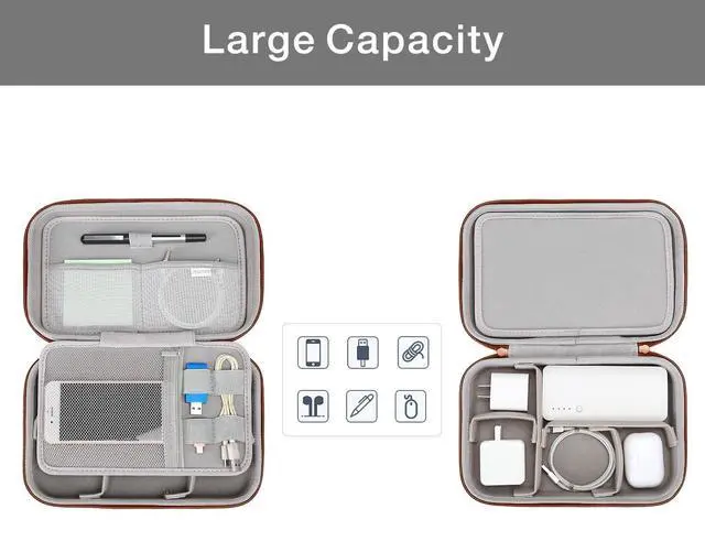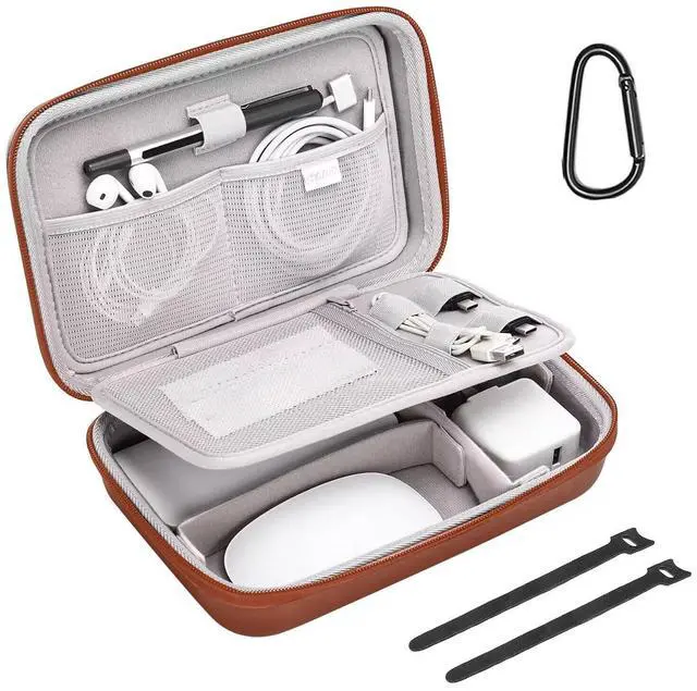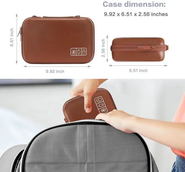 Internal Dimensions: 9.25 x 5.9 x 2.56 inches (L x W x H). Packing including 1 hard case, 1 moving interlayer, 1 snap hook, 2 cable tie, 4 modular inserts. ^^ Made of durable EVA material with PU leather exterior, shockproof, dustproof and waterproof. Soft velvet filled interior can prevent your electronic accessories from scratch and damage. ^^ Full open design. 2 mesh pockets and pencil elastic band on the moving interlayer. You can paste it on the top or intermediate on the fix interlayer. Zipper mesh pocket and 4 elastic band on the fix interlayer. 4 removable modular inserts in the compartment is designed as customized dividers for different electronics accessories. Customer can adjust the space based on their needs. ^^ Double zippers on the carrying case glide smoothly and allows convenient access to your electronic accessories and other accessories. ^^ This multifunctional electronics carrying case storage bag is designed to be compatible with MacBook power adapter, compatible with Magic Mouse & Pencil, compatible with AirPods, SD card, cable, charge, power bank, USB flash disk and other accessories.