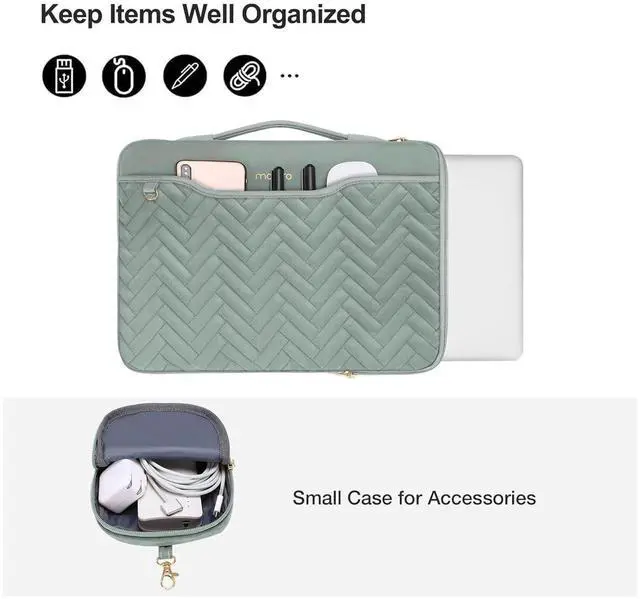 External Dimensions: 14.17 x 10.04 x 0.79 inches (L x W x H). The additional small pouch bag dimension: 4.92 x 6.3 x 1.18 inch (L x W x H). ^^ Made with rectangle quilted polyester material. 360 degree all around protective reinforced interior edge briefcase carrying case bag protect your laptop from any accidental dropping. Features a polyester foam padding layer and fluffy cushion for bump and shock absorption and protection of your device against dust, dirt, bump, shock and accidental scratches. ^^ Additional small storage pouch bag for you to storage laptop mouse and earphone. Same color as the big sleeve bag, harmony and stylish. Simple and exquisite rectangle puffy appearance carrying sleeve case cover bag is ideal for you to take your laptop out. ^^ Considerate design is the back trolley suitcase belt for ease use during business trip. It is really convenient for your happy journey to any where. Simple and exquisite rectangle quilted appearance carrying sleeve case cover bag with handle and pocket is ideal for you to take your laptop out. ^^ Compatible with MacBook Air 13 13.3 13.6 M4 A3240 M3 A3113 M2 A2681 M1 A2337 A2179 A1932 A1369 A1466 2010-2025, compatible with MacBook Pro 14 2025-2021 M5 M4 M3 M2 M1 A3434 A3112 A3185 A3401 A2918 A2992 A2779 A2442, compatible with MacBook Pro 13 2008-2025 M2 A2338 M1 A2251 A2289 A2159 A1989 A1708 A1706 A1425 A1502 A1278; Compatible with Surface Laptop 13.8 /Surface Book 3/2/1 13.5 /Surface Laptop 4/3/2/1 13.5; Compatible with Dell XPS/Latitude 13; Compatible with HP Elitebook/Spectre/Envy/Stream 13.