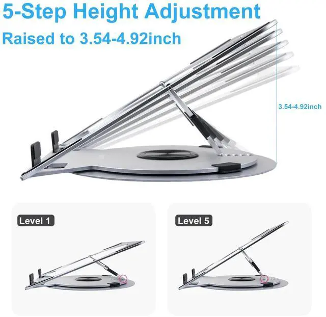 Dimension: 9.26 x 9.29 x 0.67 inch (L x W x H), suitable for all laptop, tablet, keyboard. Works on flat surface. It is an ideal companion for computer workers. ^^ 360 degree Rotation. The computer stand with 360 degree rotating base which is more flexible. The laptop stand allows you to rotate the laptop to any angle. It fits for work, creativity, and play. ^^ Ergonomic adjustable height. This foldable laptop stand lets you adjust both height and angle, flexibly raising your screen from 1.18 inches to 15 inches for ergonomic alignment. Minimize neck strain. ^^ Stable and durable. Crafted from aluminum alloy, this laptop stand delivers rock-solid stability. Integrated non-slip silicone pads securely grip your device, preventing slips and scratches even during intense typing sessions. ^^ Universal compatibility. This laptop stand seamlessly compatible with MacBook Pro/Air, compatible with Dell, compatible with ASUS, compatible with Lenovo, compatible with HP, compatible with Microsoft, compatible with Toshiba, compatible with Samsung, and compatible with all 10 to 17.3 inch laptops. Whether studying at home, working in offices/meeting rooms, or even balancing on cluttered desks - it's your good working companion.