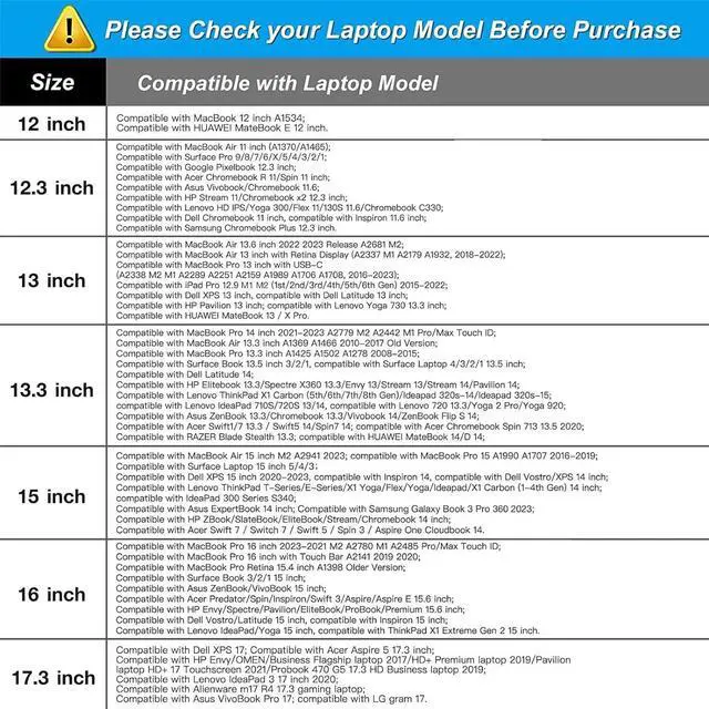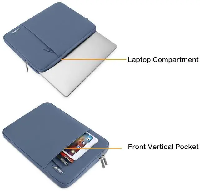 External dimensions: 14.17 x 0.79 x 10.63 inches (L x W x H). The front vertical side pocket dimensions: 9.25 x 9.84 inches (L x W). ^^ Made with polyester material, a top opening zipper gliding smoothly and allows convenient access to your device. Slim and lightweight, does not bulk your device up and can easily slide into your briefcase, backpack or other bag. ^^ Extra pocket in front provides enough space to keep mouse, earphone, pens and notepads, offering added convenience. This protective carrying sleeve case cover bag with pocket is ideal for you to take your laptop notebook computer out. ^^ Features a polyester foam padding layer and fluffy fleece fabric lining for bump and shock absorption and protection of your device against bump, shock and accidental scratches. ^^ Compatible with MacBook Pro 14 2025-2021 M5 M4 M3 M2 M1 A3434 A3112 A3185 A3401 A2918 A2992 A2779 A2442, compatible with MacBook Air 13 2017-2010 A1369 A1466, compatible with MacBook Pro 13 A1425 A1502 A1278 2008-2015; Compatible with Surface Book 3/2/1 13.5 / Surface Laptop 6/5/4/3 13.5 /Surface Laptop 13.8; Compatible with Dell Latitude/Chromebook 13.3; Compatible with HP Elitebook/Spectre/Envy/Stream 13.3; Compatible with Lenovo IdeaPad/ThinkPad Yoga 13.3; Compatible with Acer Chromebook Spin 13.3.