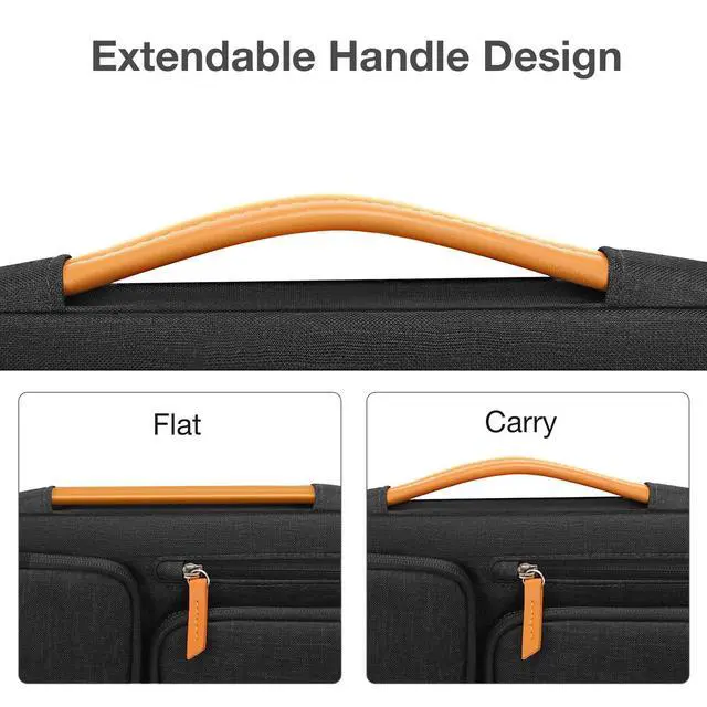 Vertical pocket dimensions: 3.74 x 6.69 inches (L x W). ^^ 360 degree all around protective reinforced interior edge briefcase carrying case bag protect your laptop from any accidental dropping. Extendable handle design makes it to carry your laptop around in comfort, you can also tuck away the handle. Side opening zipper design, avoid accidental dropping of your laptop while carrying. 4 front zipper pockets provide enough space to keep mouse, earphone, pens and notepads, offering added convenience. ^^ The laptop sleeve with organizer pockets outer polyester fabric of the case enable you to carry your laptop / notebook / Ultrabook computer in a uniquely sleek style. Features a polyester foam padding layer and fluffy cushion for bump and shock absorption and protection of your device against dust, dirt, bump, shock and accidental scratches. ^^ Considerate design is the back trolley suitcase belt for ease use during business trip. It is really convenient for your happy journey to any where. Slim and lightweight; does not bulk your laptop up and can easily slide into your briefcase, backpack, or other bag. This protective carrying sleeve case cover bag with handle and pockets is ideal for you to take your laptop out.