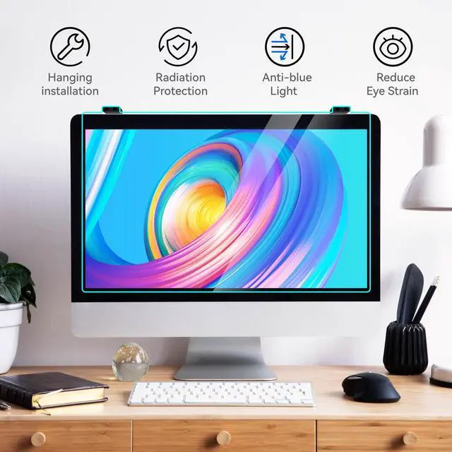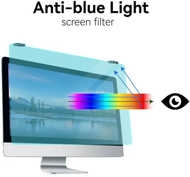 Dimension: 19.29 x 12.48 inch/L x W. This computer blue light blocking screen filter film is design for diagonally measured 20, 21.5, 22 inch 16:9 widescreen desktop PC LED monitor. Please measure the width and height of your computer screen before purchase. ^^ Protects your eyes by filtering and curbing 99% harmful UV. Anti-blue light between 420nm - 460nm can be reduced by 45% for HEV protection. Effectively reduce eye strain and fatigue caused by the UV and blue light. ^^ This upgraded anti-blue light screen protector is available on both sides, one matte side for glare protection and the other side is a smooth HD side. The matte film to effectively reduce glare and reflection, blocking external light interference. The high definition film will ensures maximum resolution. ^^ Made of Acrylic. It can effectively prevent screen from dust, fingerprint and scratches. Ultra thin to 0.01 inch of 95% clear transparency, which will not darken your laptop screen, keeping the original screen brightness. Suitable for office / home OL, gamer and programmer. ^^ Easy to install, just remove the surface film on each side and hang on the monitor screen.