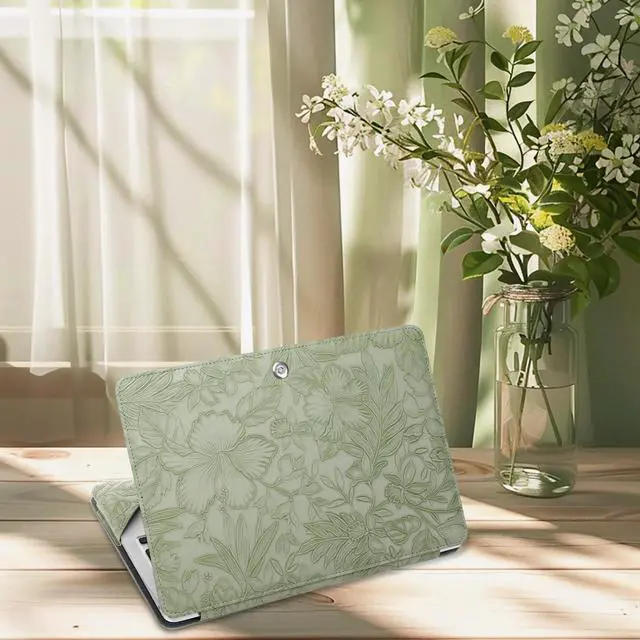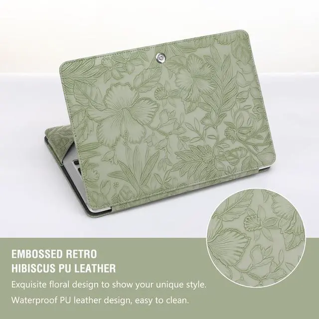 WARNING: This case is NOT compatible with other model laptops. ^^ Protective case cover with shock-absorbing features. All device features are accessible through cut-outs and openings. Magnetic closure design make sure your laptop securely in place. ^^ Made of waterproof embossed retro hibiscus PU leather material. Simple style portfolio stand case cover with clear straps at the top corners. Won't block your screen. ^^ Unique protective design allows operating your laptop freely without removing the case.