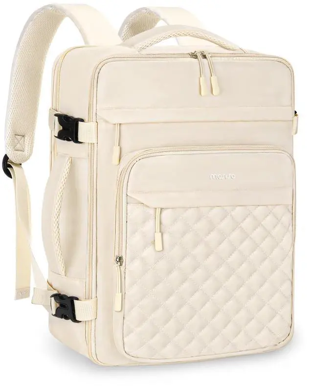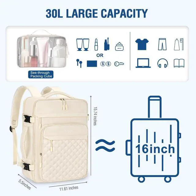 ^^ Multi Compartment Design: This backpack has 2 main compartments, 3 front zipper pockets and comes with a packing cubes. Holds about 30L. The main compartment features a full 180-degree opening with wet / dry zippered pockets, providing plenty of room for clothes, toiletries and travel essentials. The back compartment is a laptop compartment that can fits up to 16 inch laptop. The stylish rhombus quilted design and convenient compartments are perfect for weekend trips and short plane trips. ^^ With