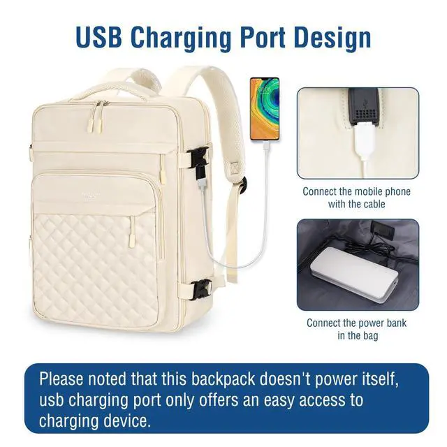 USB Charging Port: With built in USB charging port outside and built in charging cable inside, this backpack offers you a convenient way to charge your phone while walking. Please noted that this backpack doesn't power itself, USB charging port only offers an easy access to charging device. ^^