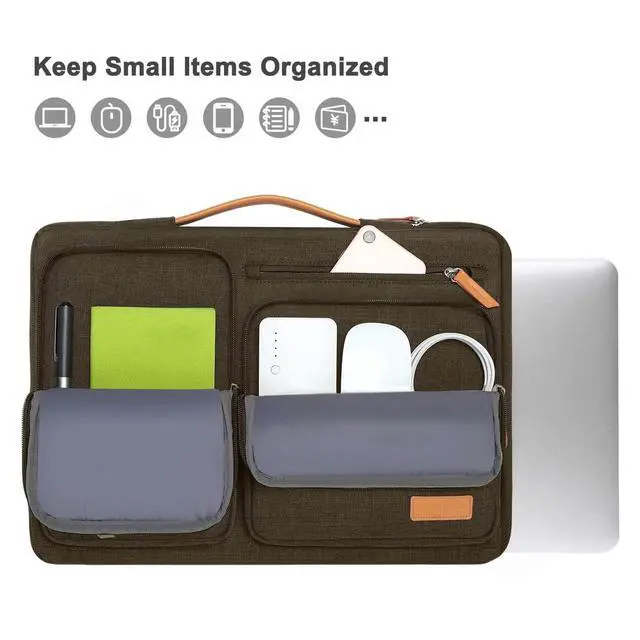 Vertical pocket dimensions: 3.74 x 6.69 inches (L x W). ^^ 360 degree all around protective reinforced interior edge briefcase carrying case bag protect your laptop from any accidental dropping. Extendable handle design makes it to carry your laptop around in comfort, you can also tuck away the handle. Side opening zipper design, avoid accidental dropping of your laptop while carrying. 4 front zipper pockets provide enough space to keep mouse, earphone, pens and notepads, offering added convenience. ^^ The laptop sleeve with organizer pockets outer polyester fabric of the case enable you to carry your laptop / notebook / Ultrabook computer in a uniquely sleek style. Features a polyester foam padding layer and fluffy cushion for bump and shock absorption and protection of your device against dust, dirt, bump, shock and accidental scratches. ^^ Considerate design is the back trolley suitcase belt for ease use during business trip. It is really convenient for your happy journey to any where. Slim and lightweight; does not bulk your laptop up and can easily slide into your briefcase, backpack, or other bag. This protective carrying sleeve case cover bag with handle and pockets is ideal for you to take your laptop out.
