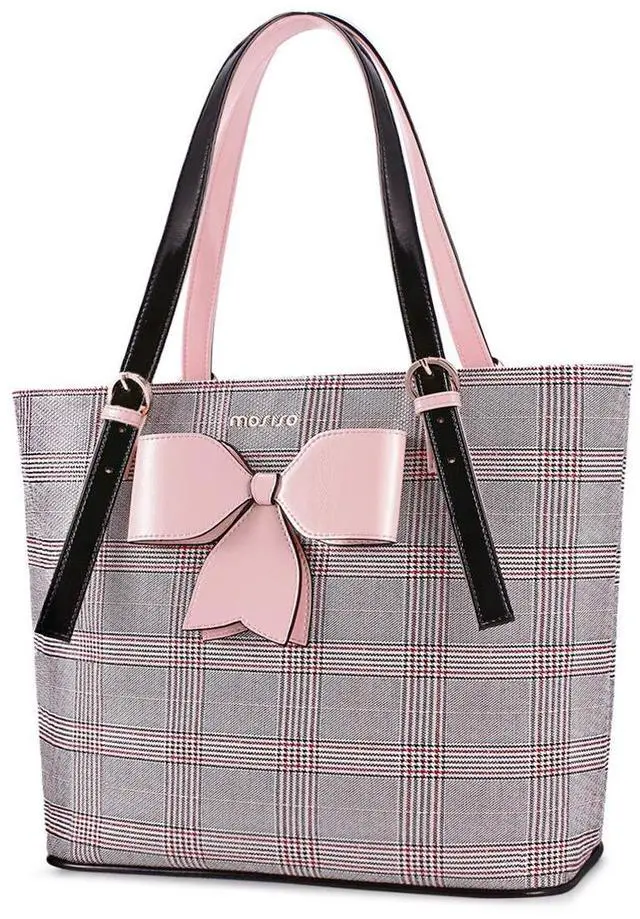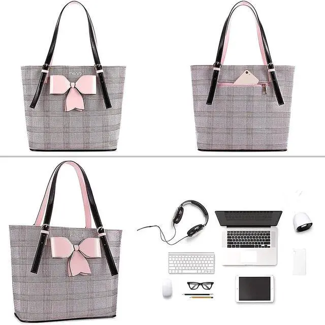 inner zipper compartment dimension: 15.75 x 10.63 inch. Compatible with notebook and ultrabook 14 inch, 15 inch, 15.6 inch and up to 16 inch; may not snugly compatible with all computers. ^^ Made of waterproof PU leather material, durable and fashion. Roomy enough with 3 compartments for all your daily stuff. The biggest compartment in the middle provides a thick padded foam section with a hook & loop strap closure for your laptop or tablet. Professional design to protect your laptop against accidental impacts and scratches. The other two side compartments for mobile phone, keys, mouse, passports, credit cards, cash, makeups and so on. ^^ Perfect for daily use, casual use and professional use too, convenient and comfortable. Removable shoulder strap allows you to carry it as a crossbody bag, shoulder bag or tote bag. ^^ Grid trendy laptop tote bag with cute bowknot, easily catch everyone's eyes, available for women and ladies. Ideal for shopping, office, business trip, work, weekend, outdoor activities, outdoor holiday, travel, gyms, camp, etc.