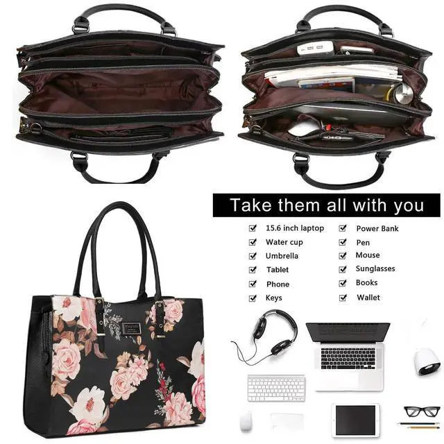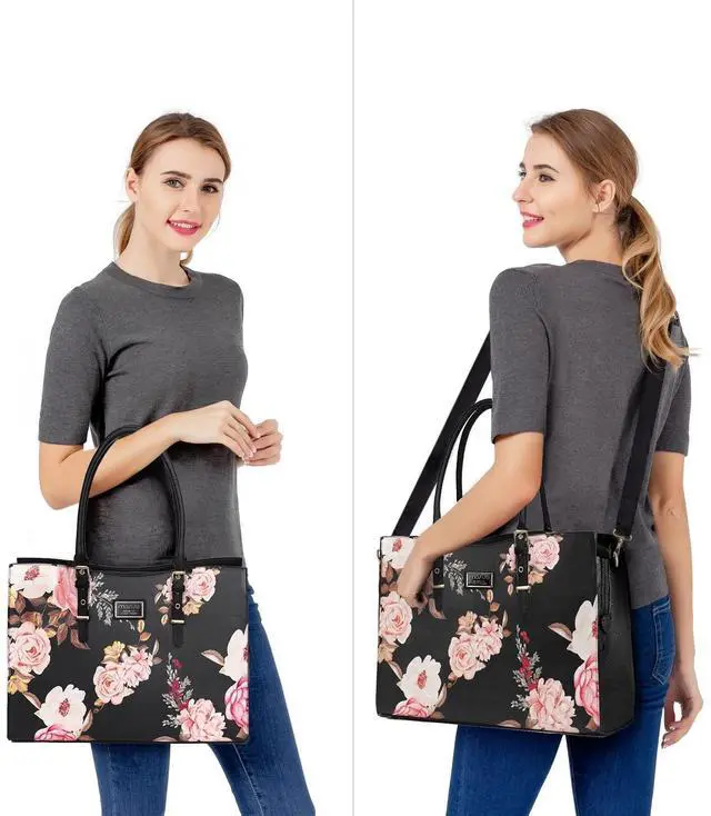 Back compartment dimensions: 16.33 x 10.24 inch (L x W). ^^ Made of peony PU leather material, durable and fashion. Roomy enough with 3 compartments for all your daily stuff. The computer compartment in the middle provides a thick padded foam section for your laptop or tablet. Professional design to protect your laptop against accidental impacts and scratches. The other two side compartments for mobile phone, keys, mouse, passports, credit cards, cash, makeups and so on. Reinforced bottom with 4 rivets protects your bag from damage. ^^ Removable and adjustable padding shoulder strap varied from 31.89 -maximum 57.08 inch. Removable shoulder strap allows you to carry it as a crossbody bag, shoulder bag or tote bag. ^^ This attractive peony fashionable laptop tote bag is ideal for daily use at shopping, office, business trip, work, weekend, outdoor activities, outdoor holiday, travel, gyms, camp, etc. Nice size admirably suits women and adults. ^^ Compatible with HP 2019 Probook 470 G5 17.3 HD Business laptop; compatible with HP 17.3 inch HD+ Premium laptop 2019; compatible with HP OMEN 17; compatible with HP Envy 17; compatible with HP 17.3 Business Flagship laptop 2017; compatible with Dell XPS 17 inch; compatible with Asus VivoBook Pro 17; compatible with LG gram 17 inch and most popular 17- 17.3 inch Ultrabooks / Notebook / Tablet / PC Computer / Laptop.