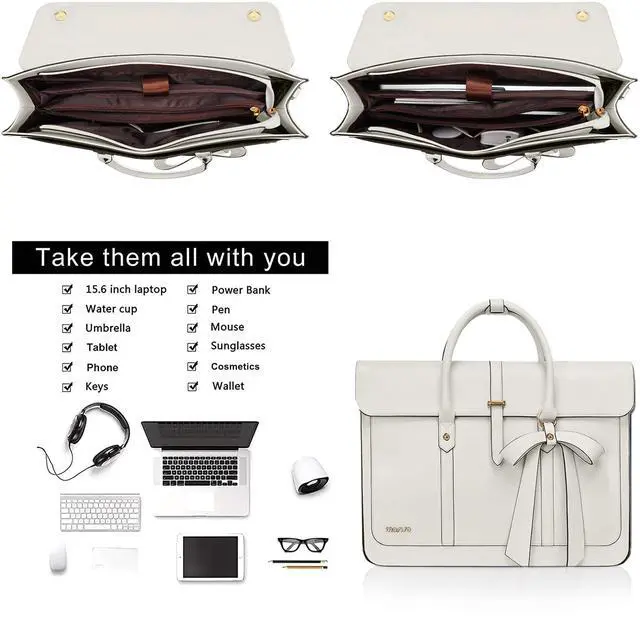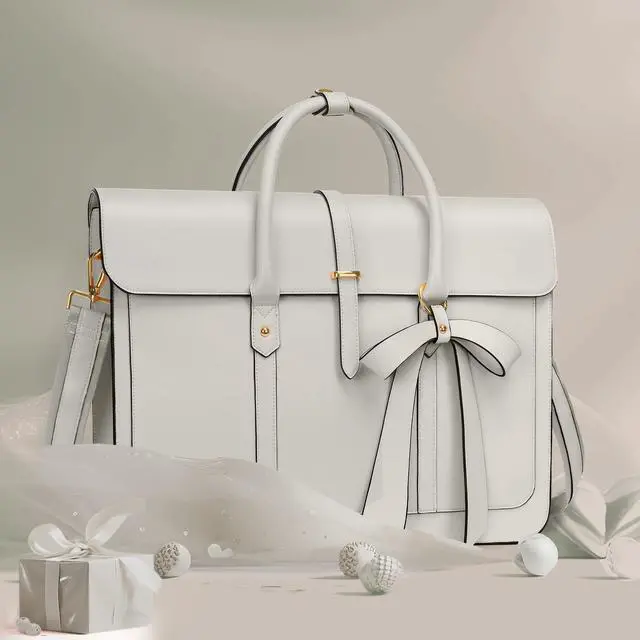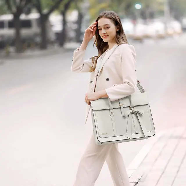 MOSISO Laptop Bag for Women, 15-15.6 inch PU Leather Laptop Shoulder Bags Convertible Backpack, 16 inch Messenger Bags Casual Handbag Work Briefcase Travel Computer Bag with Bowknot, Beige