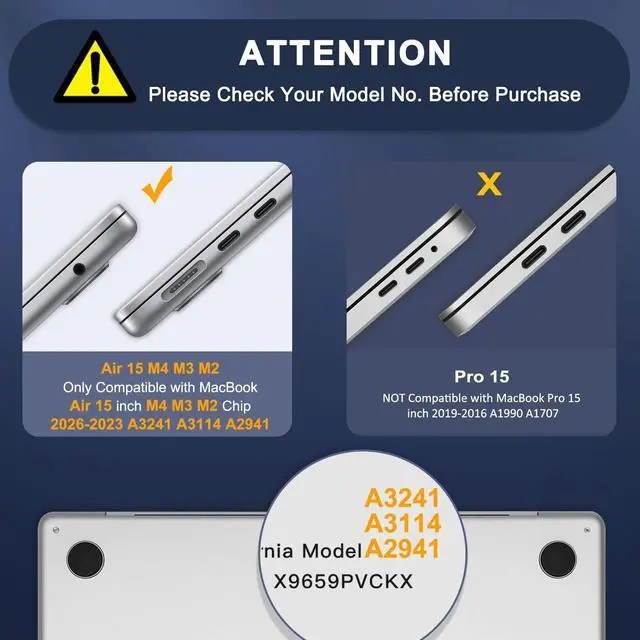 Friendly Note: Please kindly check the model number "Axxxx" on the back of the laptop before your purchase. Make sure you choose the exact same model number as the listing title stated "A3448" or "A3241" or "A2941" or "A3114" that compatible with MacBook Air 15 inch case, compatible with MacBook Air M5 15 inch case, compatible with MacBook Air M4 15 inch case, compatible with MacBook Air M3 15 inch case, compatible with MacBook Air M2 15 inch case, compatible with MacBook Air 15 inch case A3448, compatible with MacBook Air 15 inch case A3241, compatible with MacBook Air 15 inch case A3114 and compatible with MacBook Air 15 inch case A2941.