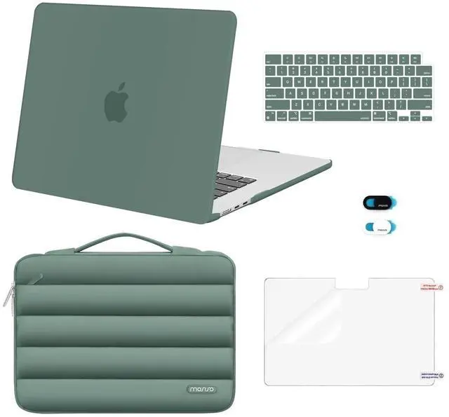 Including 1 protective plastic hard shell case cover (compatible with MacBook Air 15 inch case 2026, compatible with MacBook Air 15 inch case 2025, compatible with MacBook Air 15 inch case 2024 and compatible with MacBook Air 15 inch case 2023), 1 matching color 360 degree protective shockproof puffy laptop sleeve with handle carrying bag, 1 matching color keyboard cover, 1 screen protector and 2 privacy webcam slide covers. The 360 protective sleeve bag protect your laptop against hard knocks, scratches and spills.
