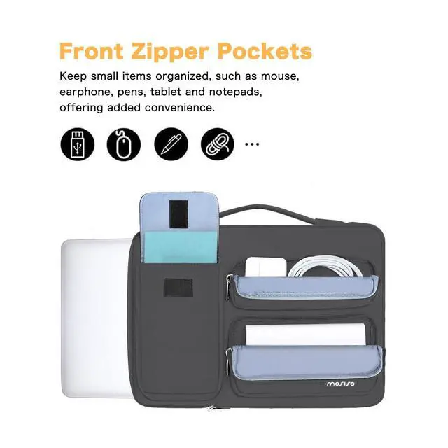 Right big raised pocket dimension: 7.68 x 3.94 inches (L x W x H). ^^ 360 degree all around protective reinforced interior edge briefcase carrying case bag protect your laptop from any accidental dropping. Extendable handle design makes it to carry your laptop around in comfort, you can also tuck away the handle. Side opening zipper design, avoid accidental dropping of your laptop while carrying. 2 raised & 1 flapover pockets are convenient for quick-access and store cell phone, wallet, keys and other small items. ^^ Multifuncional laptop sleeve with 3 front organizer pockets design enables you to carry your laptop / notebook / Ultrabook computer in a uniquely sleek style. Features a polyester foam padding layer and fluffy cushion for bump and shock absorption and protection of your device against dust, dirt, bump, shock and accidental scratches. ^^ Considerate design is the back trolley suitcase belt for ease use during business trip. It is really convenient for your happy journey to any where. Slim and lightweight; does not bulk your laptop up and can easily slide into your briefcase, backpack, or other bag. This protective carrying sleeve case cover bag with handle and pockets is ideal for you to take your laptop out.