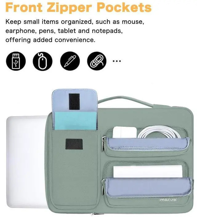 • 360 degree all around protective reinforced interior edge briefcase carrying case bag protect your laptop from any accidental dropping. Extendable handle design makes it to carry your laptop around in comfort, you can also tuck away the handle. Side opening zipper design, avoid accidental dropping of your laptop while carrying. 2 raised & 1 flapover pockets are convenient for quick-access and store cell phone, wallet, keys and other small items.