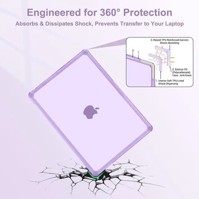 • Reinforced Bumper Corners & Full-Surround Shock Absorption: Four fortified bumper corners absorb shock from drops and bumps, while a shock-absorbing TPU (Thermoplastic Polyurethane) bumper wraps every side - cushioning against backpack pressure, desk knocks and daily accidents. Together, they create a 360 degree protective defense that prevents force from reaching your laptop. Built for life on the move, not just sitting still