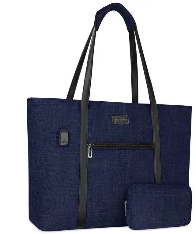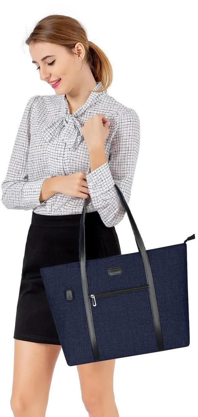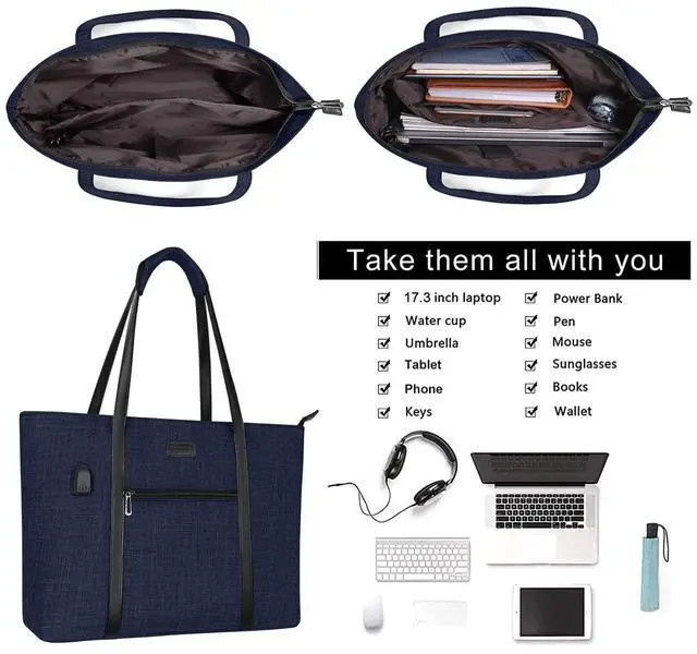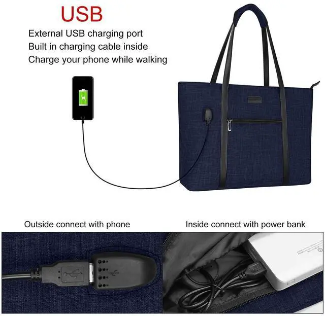 The small pouch case dimension: 7.87 x 4.92 inch (L x W). Compatible with MacBook, Notebook, Ultrabook 17 inch and up to 17.3 inch; may not compatible with all laptops. ^^ Roomy enough with 2 compartments for all your daily stuff. The computer compartment provides a thick padded foam section with a hook & loop strap closure for your laptop. Professional design to protect your laptop against accidental impacts and scratches. The other side compartment for magazines. The small pocuh case for mobile phone, keys, mouse, passports, credit cards, cash, makeups and so on. ^^ Perfect for daily use, casual use and professional use too, convenient and comfortable. With built in USB charging port outside and built in charging cable inside, this laptop tote bag offers you a convenient way to charge your phone while walking. Please noted that this laptop tote bag doesn't power itself, usb charging port only offers an easy access to charging device. ^^ Durable sturdy flat PU handle with detachable wrapped pad for long time comfortably carrying. This attractive fashionable laptop tote bag is ideal for daily use at shopping, office, business, work, weekend, outdoor activities, travel, gyms, camp, etc.