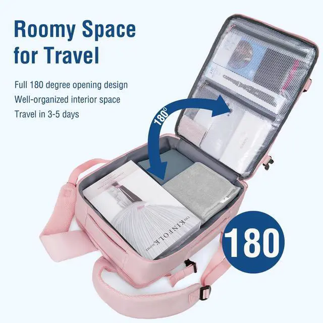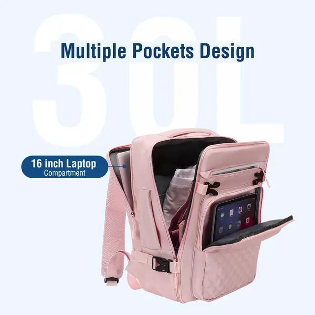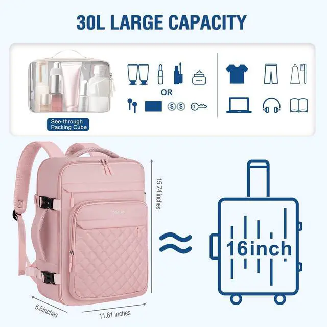 ^^ Multi Compartment Design: This backpack has 2 main compartments, 3 front zipper pockets and comes with a packing cubes. Holds about 30L. The main compartment features a full 180-degree opening with wet / dry zippered pockets, providing plenty of room for clothes, toiletries and travel essentials. The back compartment is a laptop compartment that can fits up to 16 inch laptop. The stylish rhombus quilted design and convenient compartments are perfect for weekend trips and short plane trips. ^^ With