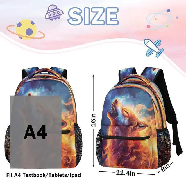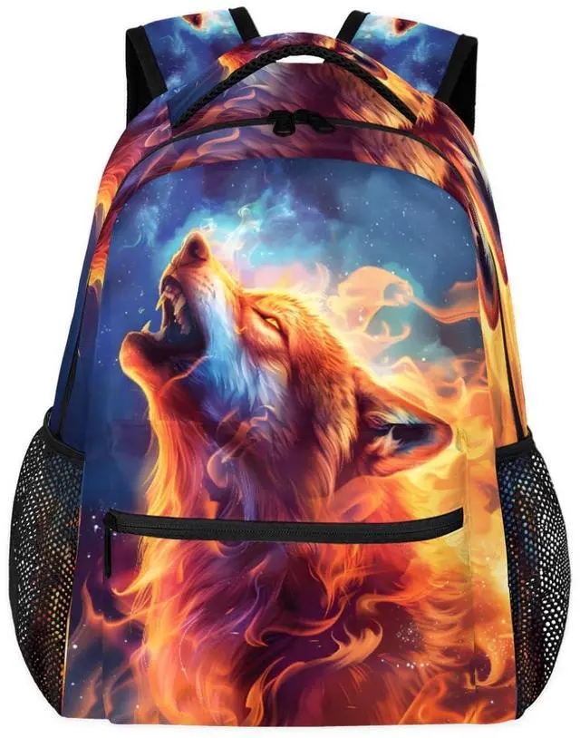 cfpolar Wolf Backpack for School, Burning Flame Wolf Galaxy Space Laptop Backpack Water Resistant Bookbag Computer Bag Travel Hiking Camping Rucksack Daypack Shoulder Bag for Teenager Boys Girls Kids